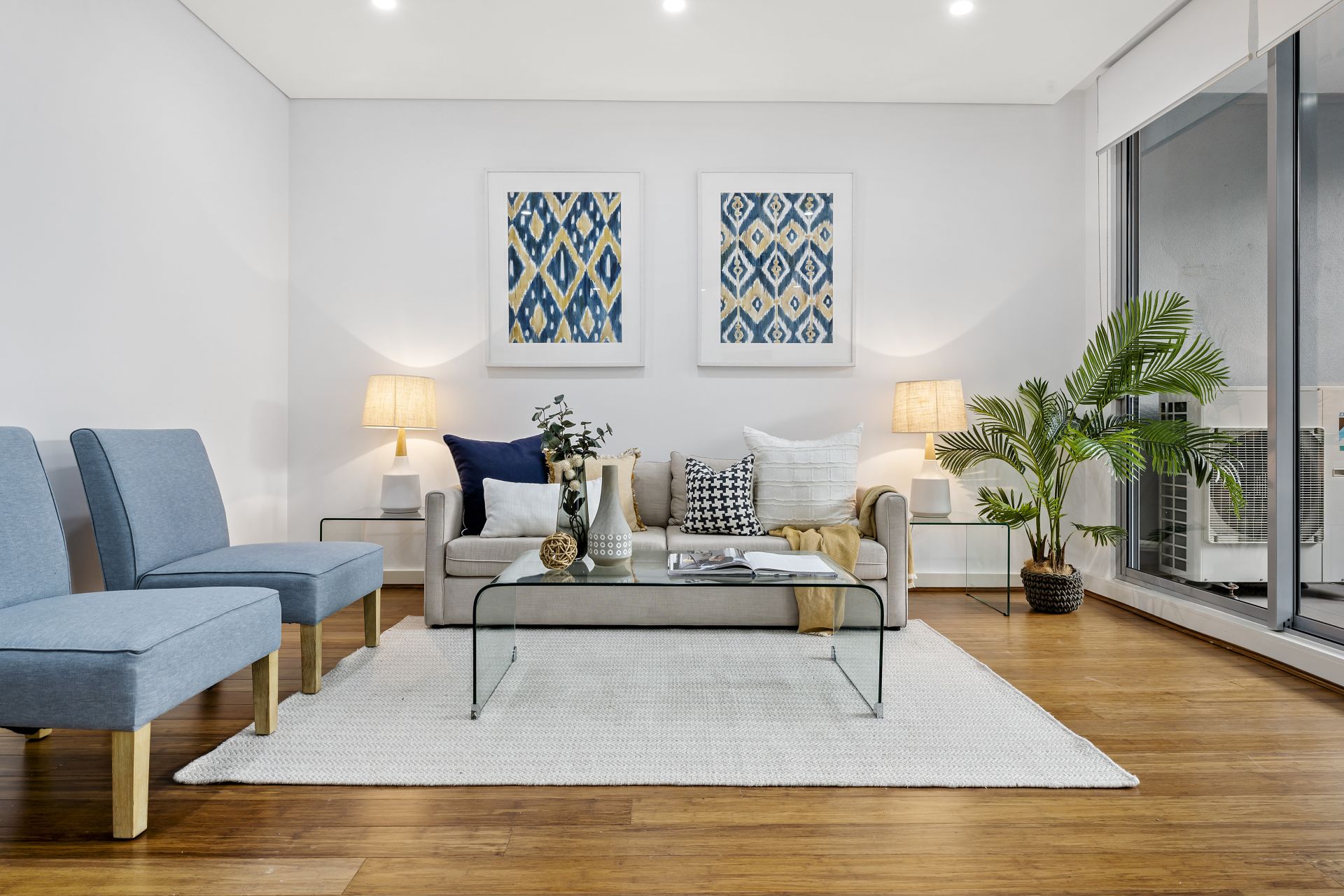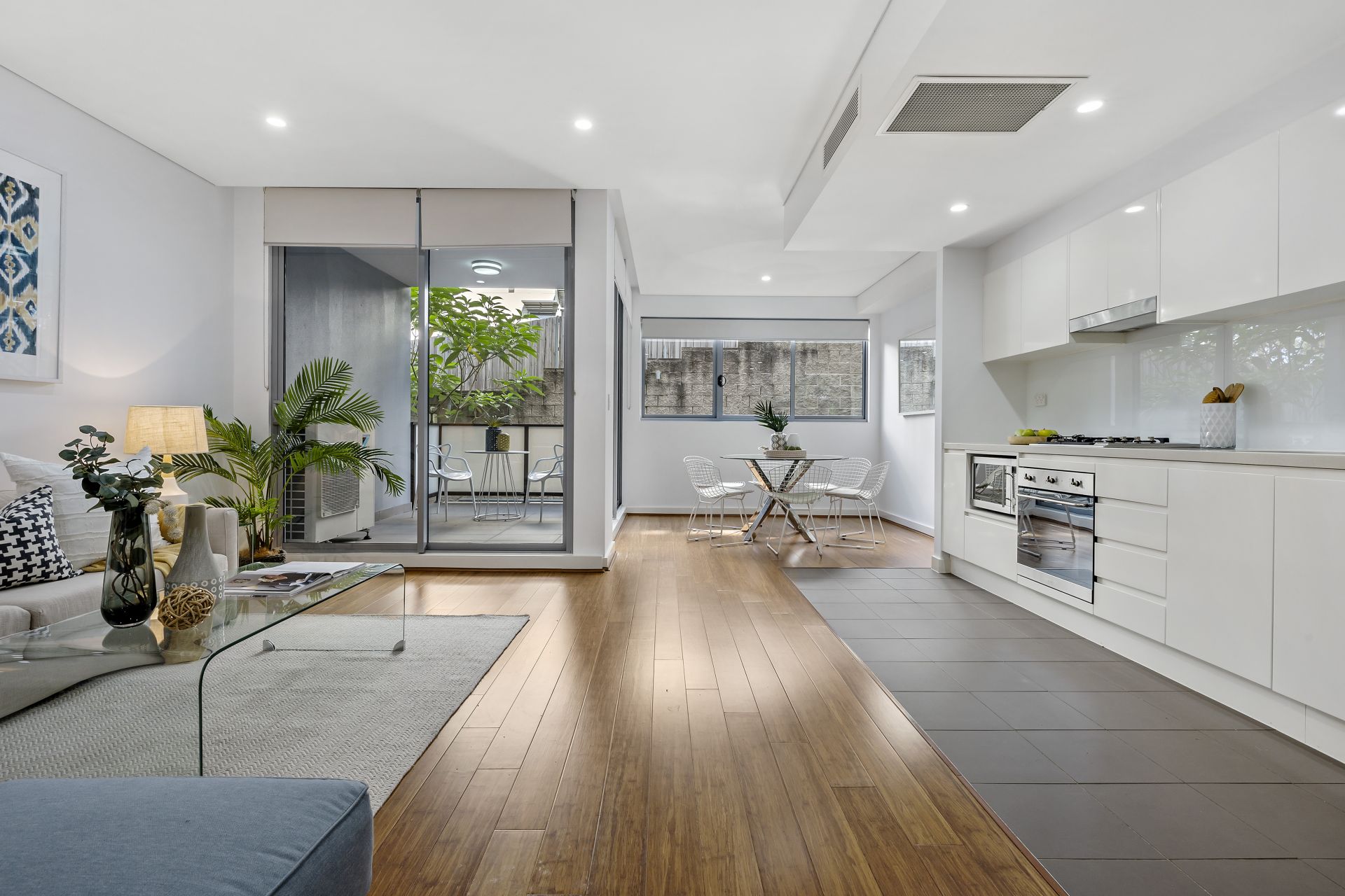 This stylish two-bedroom, two-bathroom apartment offers open living, dining and kitchen that leads onto one of the two outdoor balcony spaces.