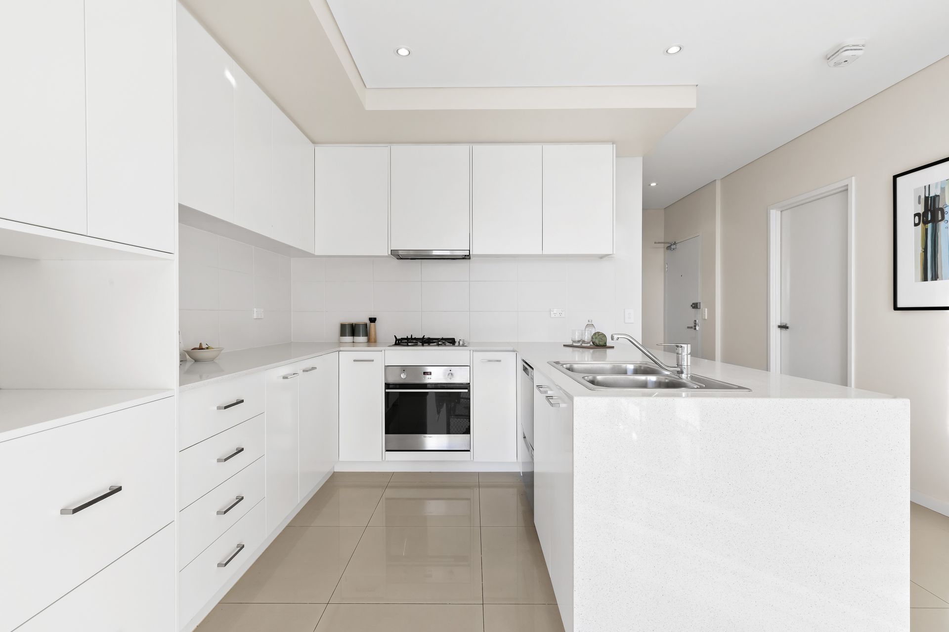 The kitchen has contemporary finishes and features gas cooking, a dishwasher and plenty of storage.